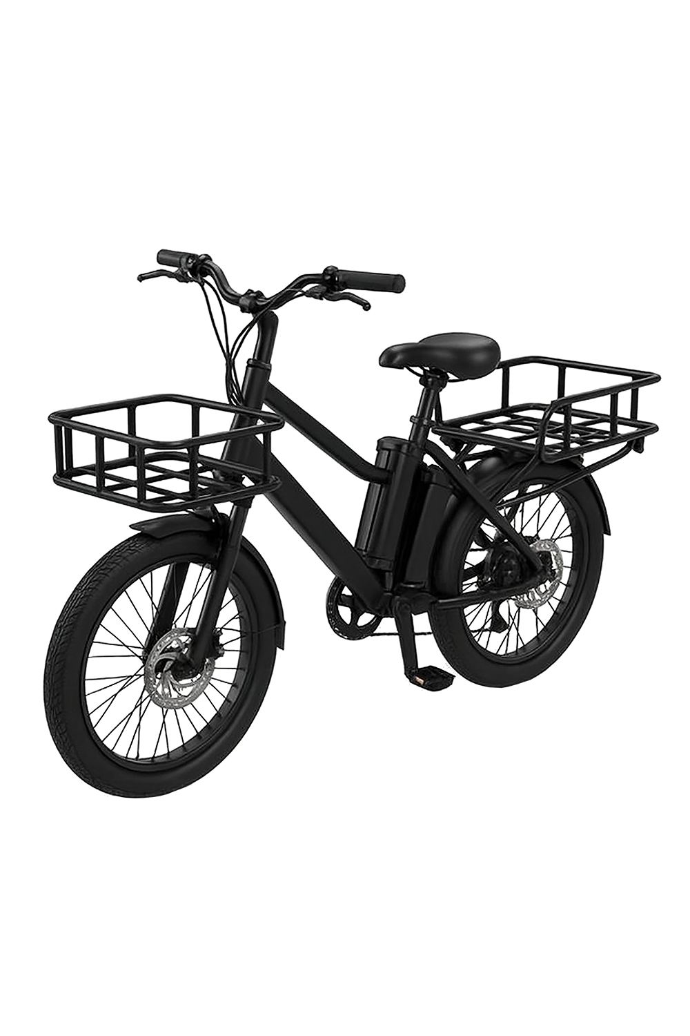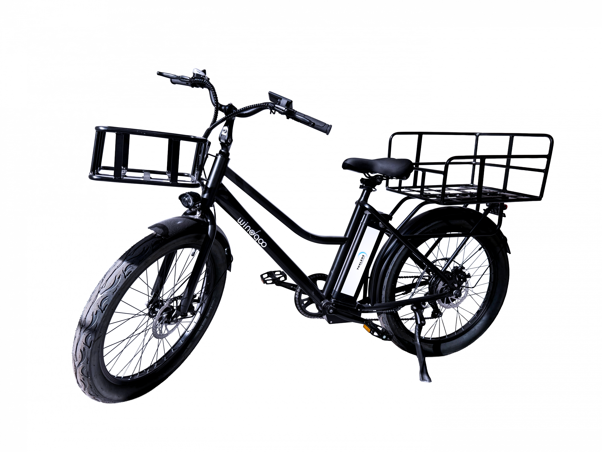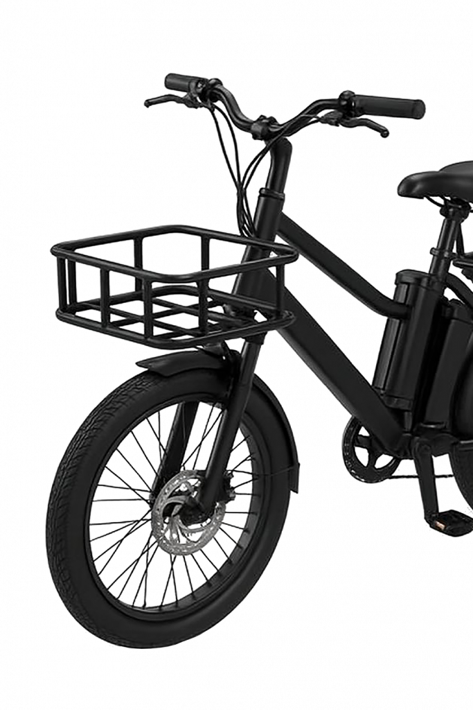 Accessoire chargement : tous nos vélos sont équipés d’un porte-bagages arrière (en acier 530 x 430 x 150 mm avec une capacité de charge 50 kg) et un panier avant (320 x 300 x 130 mm avec une capacité de charge de 7 kg).